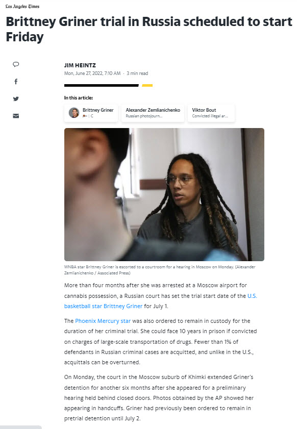 See below, from the LA Times on June 27, 2022, reporting that Brittney Griner’s trial is now set for Friday, July 1, 2022. No one can honestly believe that this will be a fair, unbiased trial. It’s obviously a kangaroo court. And whatever the outcome, it is all political. It’s too bad, as the people in Russia could be part of and participants in the worldwide community, but not with #putinthebutcher.