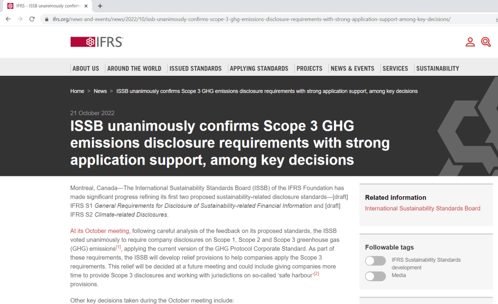 This will impact some businesses, management, boards and audit committees – in addition to disclosures for Scope 1 and Scope 2 greenhouse gas emissions (GHG), the ISSB voted to also include Scope 3 GHG. Scope 1 and Scope 2 disclosures are already difficult – Scope 3 will add significant additional difficulties and uncertainties. You can read the announcement on the IFRS website at https://www.ifrs.org/news-and-events/news/2022/10/issb-unanimously-confirms-scope-3-ghg-emissions-disclosure-requirements-with-strong-application-support-among-key-decisions/.