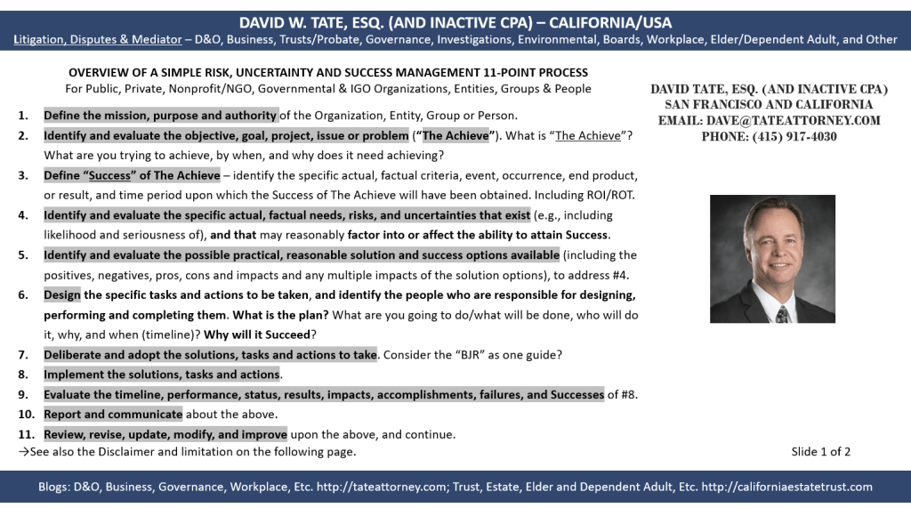 Mental health, personalities, relationships, interactions and discourse, including how people discuss, debate, disagree and argue, are some of the key issues in litigation, dispute resolution, mediation and settlement, and are also key issues and problems in the community at large. I encourage leaders and elected representatives to lead the way by using traditional debate and risk management approaches. These are huge topics – this blog post is merely a recognition. It is obvious that this Commission has spent a lot of time and effort on its draft report. As these topics are so numerous and important, I recommend that the Commission us its current work and first focus on 1, 2, or 3 primary issues and goals; define how the Commission would define “success” at this point-in-time; and identify the specific actions and tasks that will achieve that success. In other words, a specific, targeted risk management approach. Below I have added the most recent versions of my risk management process summary slide, governance definition slide, and pre-mediation questions to consider pdf.