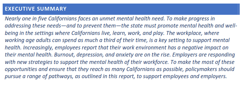 I have provided immediately below a link to and pdf copy of the recent California Mental Health Services Oversight & Accountability Commission draft Workplace Mental Health Report. Historically I have not spent much time discussing mental health and personality topics unless there was something to discuss that was law or mostly law related. However, you can see from recent posts on both of my blogs that for some of my discussions I have started discussing mental health and personality issues as it is not uncommon for those issues to at least indirectly relate to other issues that I do regularly discuss including law, litigation, conduct and possible liability, governance, risk management, and mediation/mediator services (and also discourse, debate, and dispute resolution). The following is a link to and pdf of the recent MHSOAC draft report: https://mhsoac.ca.gov/wp-content/uploads/WORKING-WELL_2022-12-20-18_22.pdf
