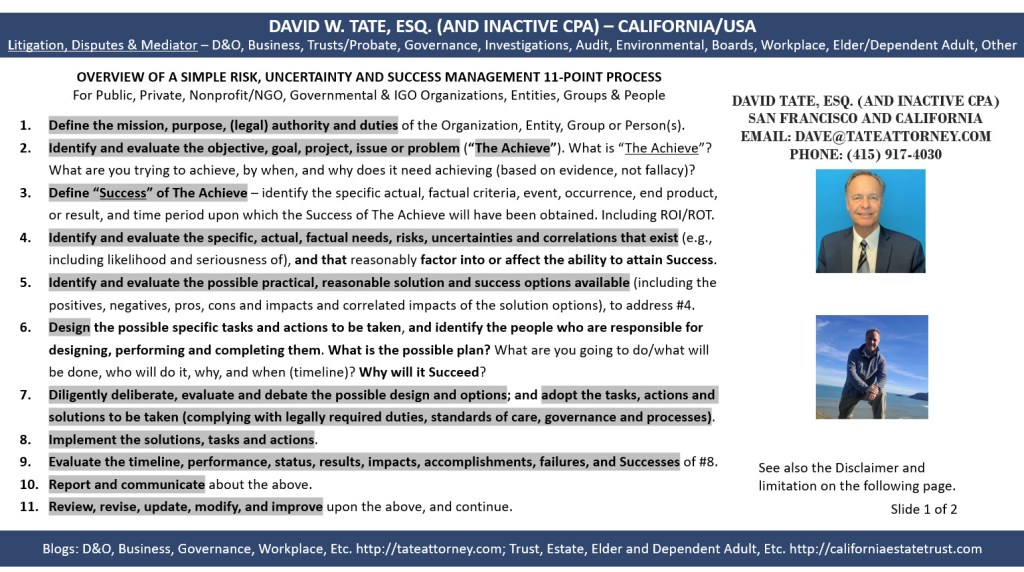 Remember, every case and situation is different. It is important to obtain and evaluate all of the evidence that is available, and to apply that evidence to the applicable standards and laws. You do need to consult with an attorney and other professionals about your particular situation. This post is not a solicitation for legal or other services inside of or outside of California, and, of course, this post only is a summary of information that changes from time to time, and does not apply to any particular situation or to your specific situation. So . . . you cannot rely on this post for your situation or as legal or other professional advice or representation, or as or for my opinions and views on the subject matter.