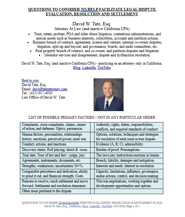 I have attached my updated Questions to Consider to Help Facilitate Legal Dispute Evaluation, Resolution and Settlement (see below the scan of the first page, and also the entire 5-page document). In particular, in the box at the bottom of the first page, you will see that multiple of the items listed, one way or another, directly or indirectly relate to human factors such as personalities, relationships, history, emotions, “must win,” and more. Since 2019 (pre-COVID), and probably even prior I have seen or been involved in more and more disputes and litigation in which personalities, relationships, and the like are not simply factors but are significant and very significant factors that influence and impact efforts to reach resolution and settlement. In addition to litigation, I provide mediator services to help parties and attorneys resolve their disputes and litigation. Be mindful that the great, great majority of cases do settle, although at least in my very contentious cases settlement often is not reached until closer to trial.